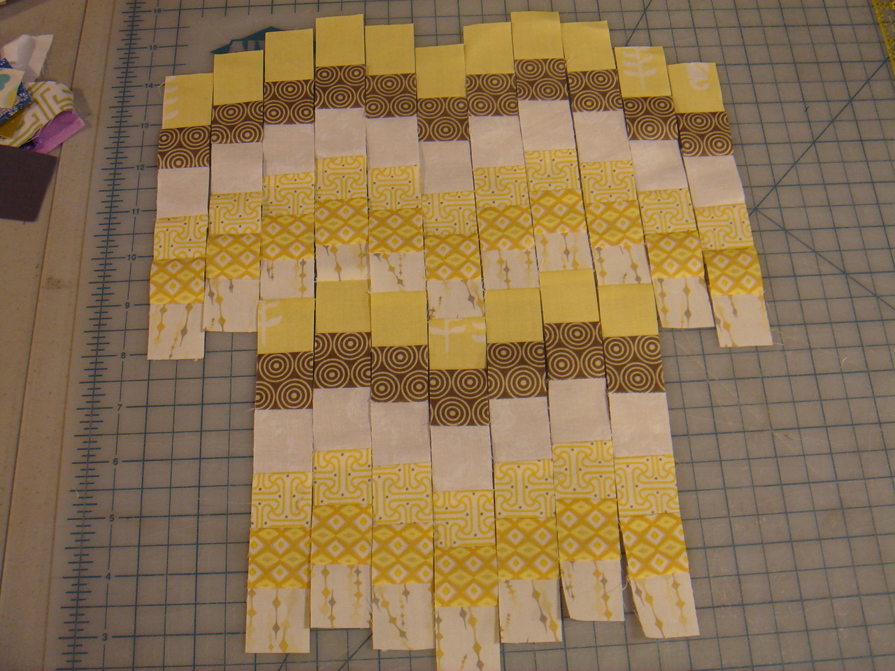 1. Sew your 6 strips together for the heart piece on the long side, right sides together, and press. I auditioned several arrangements and then changed my mind on the fly. Its part of the project! Embrace it.