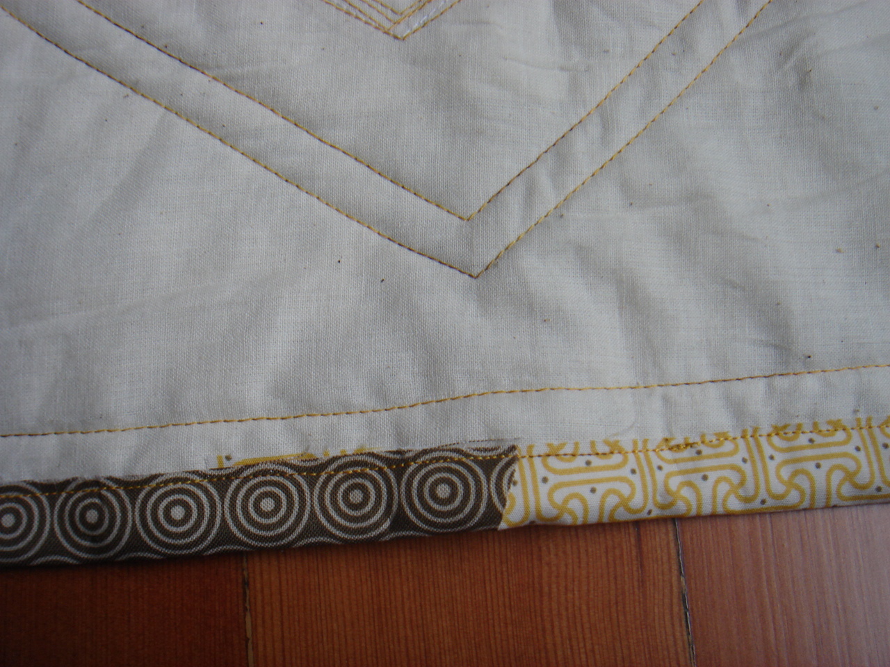 13. Place and sew the binding. I did a single fold raw-edge binding (which is why it seems so small) to keep with the wabi look. Fold your 1.5" strips in half and press, then begin placing in the center of the bottom. When you come to the corner, you can still do the mitered edge look by just moving your strip over to the next edge and coaxing the fold nice and flat. I sewed close to the raw edge, more like a finishing stitch than a 1/4" binding stitch. So simple though- one line to sew, and you're done!